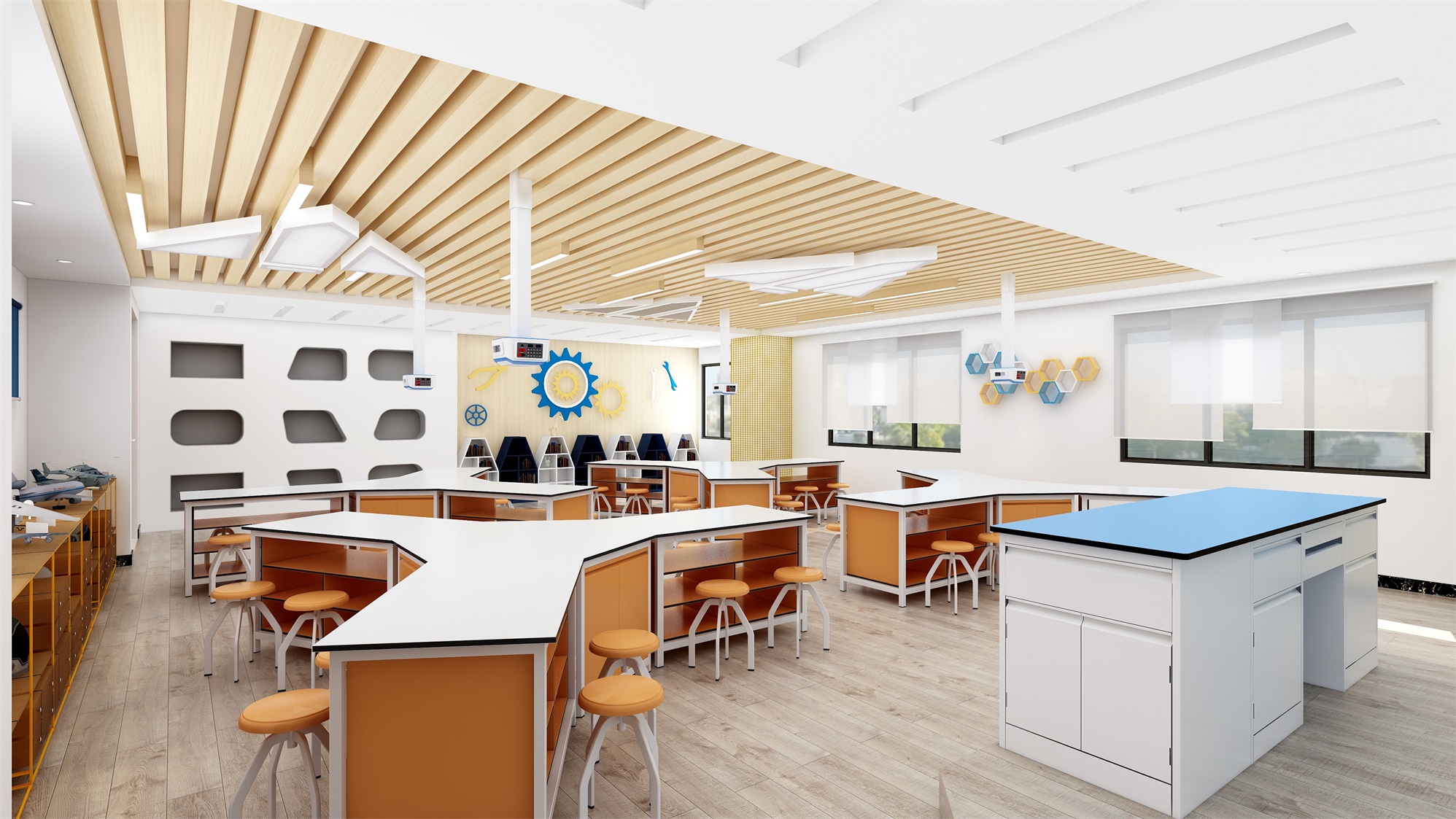 —設(shè)計理念:可選配各種顏色理化板,拼桌組合多變;一體化臺面,具有穩(wěn)定的抗菌性能,造型美觀。